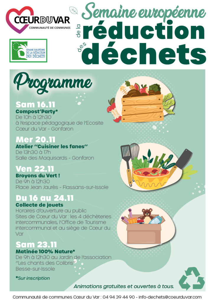La Communauté de communes Cœur du Var participe à cet événement et vous propose ainsi un programme riche en animations, pour promouvoir ses pratiques éco-responsables en faveur de la réduction des déchets.