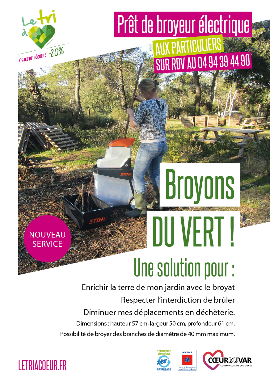 Si vous souhaitez emprunter un broyeur électrique, ou pour toute autre question, vous pouvez vous adresser directement au Pôle Préservation de l’Environnement au 04.94.39.44.90.