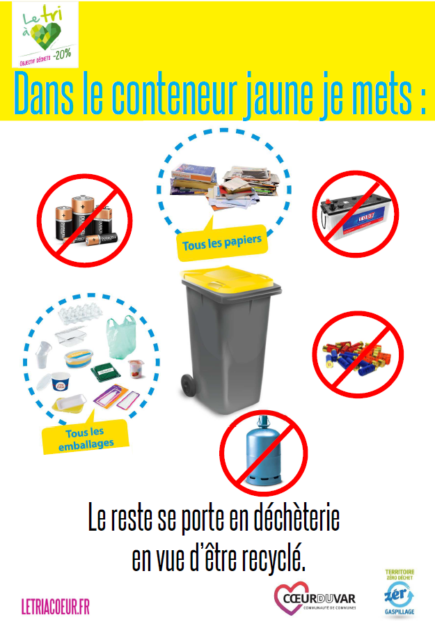 Attention certains déchets ne sont pas acceptés dans le bac jaune mais se recyclent en déchèterie comme les piles, batteries, bouteilles de gaz et cartouches de chasse.